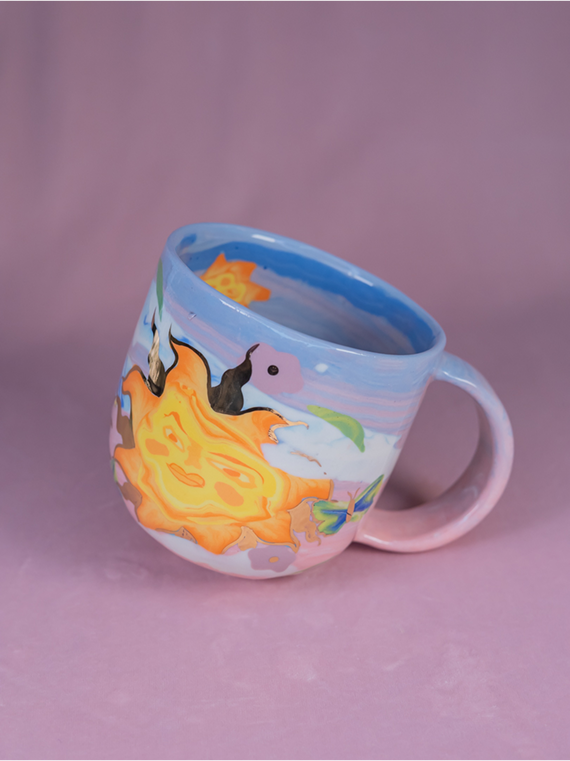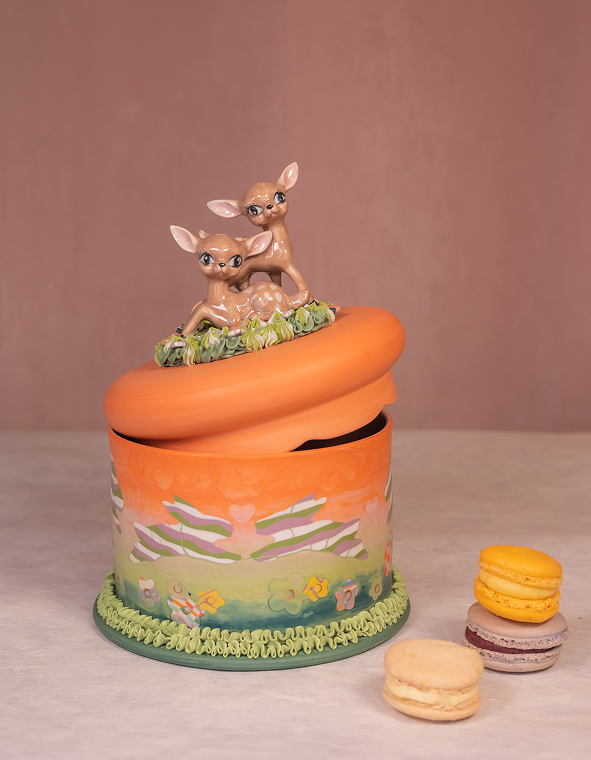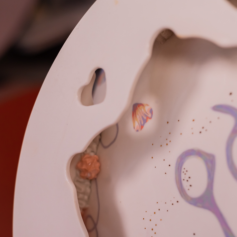 « Avec l’argile colorée comme matière première pour exprimer des concepts et des affects, je puise des motifs et symboles provenant de différents lieux de l’expérience collective, autant dans des domaines scientifiques, de la culture populaire, que de sentiments puisés dans la sphère intime. Avec ces multiples influences, je crée des objets fonctionnels à valeur esthétique et narrative dans des collections capsules autour d’un thème, d’une ambiance particulière, ou d’un souvenir subconscient. Je développe mes pièces pour leur potentiel à favoriser un sentiment d’ancrage dans la collectivité. L’objet physique est une manifestation de la chaîne invisible qui nous lie, du tissu social qu’on peut facilement oublier dans une société où la productivité économique est la valeur suprême.