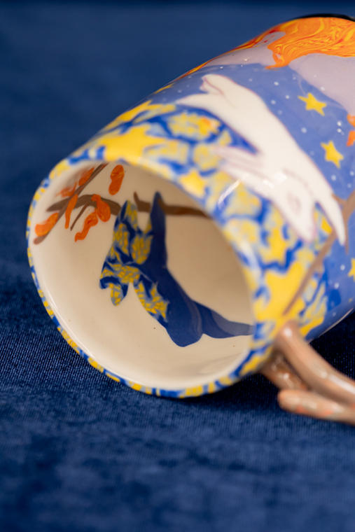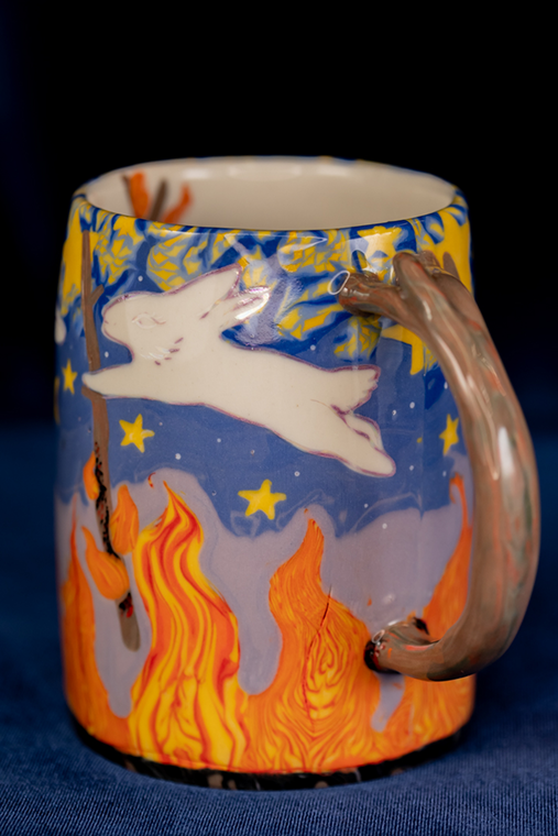 Ce liant social que je travaille à développer dans ma pratique artistique est permis autant par les récits présents dans les œuvres auxquels les gens peuvent s’associer, que par le transfert énergétique qui s’opère quand l’objet passe de la main de l’artiste à celle de l’utilisatrice ou de l’utilisateur. Il y a quelque chose de grandiose dans la valeur du travail de la poterie quand on prend conscience que les céramiques sont les dernières choses fabriquées par les humains qui resteront visibles après la disparition de l’espèce humaine. Avec cette considération toujours dans mon esprit, il m’est impossible de dissocier le travail de la poterie de l’expression du fait d’être humain. Je recherche les contrastes et les dichotomies entre la forme et son décor. La cohabitation entre la sobriété et la fantaisie est l’une de mes « manières de faire ». J’explore sans relâche la fine frontière qui se situe entre la délicatesse et le désordre. L’intime, l’enracinement, la volubilité et l’incongruité sont mes thèmes de prédilection. »