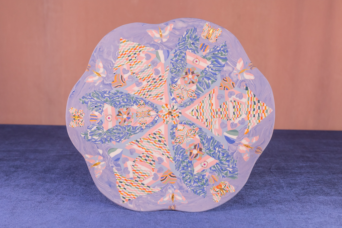 Techniques utilisées : création de motifs avec la méthode du bloc et de la canne. Façonnage à la plaque : collage, casse-tête, colombinage. Composition à partir d’une banque de motifs. Finitions sur cuir et sur sec.
